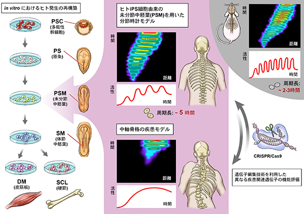 本研究グループは、このモデルを用いて未分節中胚葉(PSM)から椎骨・肋骨・骨格筋・皮膚などの元となる体節の形成を段階的に再現することに成功しました。分節時計の主要な遺伝子の発現の視覚化により、ヒトの分節時計が5時間周期で振動することを発見し、マウスの分節時計が、実際の胚と同じく2~3時間周期である事を確認しました。誘導したPSMを用いたRNAシークエンス解析により、分節時計に関係する約200個の遺伝子を同定しました。さらに、分節時計の主要な遺伝子に変異を持つiPS細胞をゲノム編集により作成し、これをPSMに誘導し、遺伝子変異が分節時計に与える影響を明らかにしました。分節時計の遺伝子変異を有する疾患、脊椎肋骨異骨症の患者より樹立したiPS細胞でこの遺伝子変異を修正すると、分節時計の異常が回復することが確認できました。