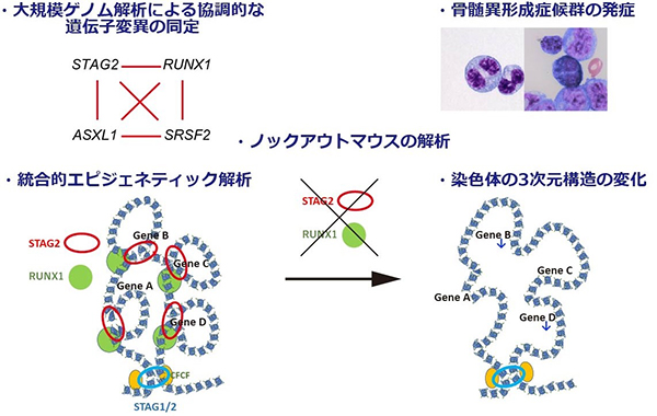 近年、本研究グループは、新規コヒーシン遺伝子変異が10-20%の白血病に認められることを報告しました。今回、本研究グループが3,000症例以上の白血病の大規模なゲノム解析、ノックアウトマウスの解析、更に次世代シーケンサーを活用した統合的エピジェネティック解析を実施した結果、(1)コヒーシンの一つである STAG2 遺伝子変異が、 RUNX1 遺伝子変異と高頻度に共存すること、(2)これらの遺伝子の両方に異常が生じることで、骨髄異形成症候群を発症すること、(3)コヒーシン変異が染色体の3次元構造の変化などのエピジェネティックな異常を引き起こし、更に RUNX1 変異が加わることでその異常が加速し、発がんに至ることなどを解明しました。