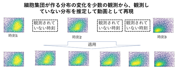 本研究では、1細胞発現データのような複雑な分布に対して情報幾何的な座標を与え、ぞれぞれの座標が説明するパターンを抽出する新しい統計手法を開発し、細胞集団プロファイルの違いや変化を低次元空間上で定量・可視化することに成功しました。この手法の応用例としては、経時的に観測したフロサイトメトリーデータから、観測時刻と観察時刻の間の分布状態を推測し、動画を再構成することが挙げられます。