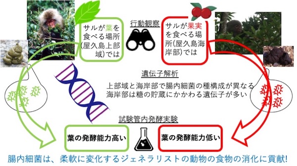 ニホンザルの腸内細菌の種構成は、葉をよく食べる地域と果実をよく食べる地域で分かれており、果実をよく食べる地域では、糖の貯蔵にかかわる遺伝子が多く腸内細菌に含まれていました。多くの種類の食物を食べるジェネラリスト(広食性)の動物では、自分自身の遺伝子ではなく、腸内細菌を柔軟に変化させて、その場所に応じた食物の消化能力を身につけている可能性が示唆されました。