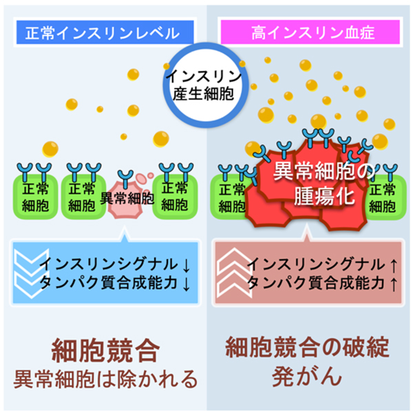 具体的には、がんのもとになる異常細胞(極性が崩壊した細胞)は、通常は周りの正常細胞と比べてタンパク質合成能力が劣っており、これにより細胞競合が起こって正常細胞により除去されます。しかし、高インスリン血症の状態では異常細胞のタンパク質合成能力が正常細胞よりも高くなり、正常細胞によって排除されなくなって腫瘍化することがわかりました。