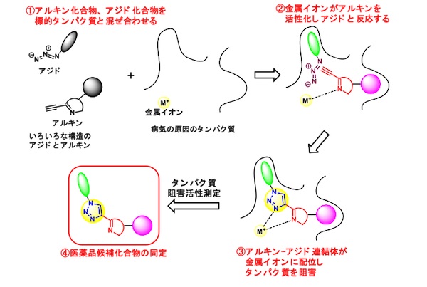 今回、本研究グループは、がんや神経精神疾患の原因である金属含有タンパク質に着目し、効率的に医薬品候補化合物が見出せることを示しました。本手法を用いることで、複数のアルキン化合物(m個)とアジド化合物(n個)の組み合わせ(m×n個)を短時間で評価することが可能です。そのため、化学者がm×n個の化合物を一つ一つ合成する必要がなく、効率的に医薬品候補化合物を探索することができます。本創薬手法を用いることで、短時間かつ少ない労力で、画期的新薬を創出できると期待されます。