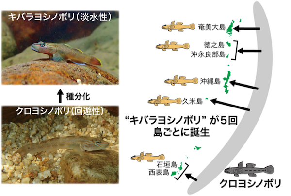 本研究グループは、琉球列島において、淡水域で一生を過ごす「キバラヨシノボリ」と呼ばれるハゼ科魚類の遺伝子を詳細に解析しました。その結果、各島の「キバラヨシノボリ」は類似した形態、色彩、生態をもつにもかかわらず、川と海を回遊する近縁種のクロヨシノボリから別々に進化しており、その回数は琉球列島全体で合計5回にも上ることが判明しました。そこでどのような特徴をもつ島で「キバラヨシノボリ」が種分化しやすかったかを解析したところ、より大きい島で種分化する確率が高いことが示されました。