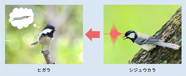図: ヒガラはシジュウカラのヘビ特異的な警戒声からヘビの姿をイメージし、探索に用いる