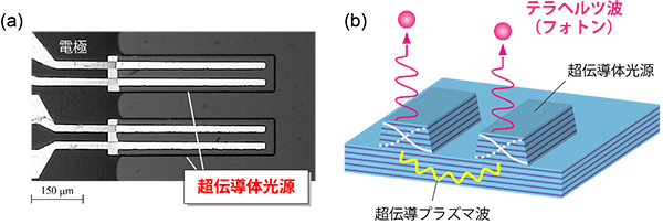 図:(a)基板上に作製した2つの超伝導体光源の顕微鏡写真(b)同期した2つの超伝導体光源の概念図