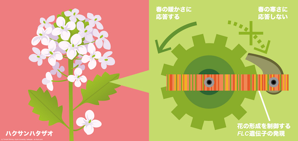 春は昼夜の気温変化が激しく、昼は暖かいですが夜は寒くなります。一方で、植物が春に開花するためには、春の暖かさのみに応答する必要があります。本研究グループは、日本に自生するアブラナ科の植物ハクサンハタザオの自然集団において、 FLC 遺伝子領域におけるヒストンとよばれるタンパク質に着目し、野外で2年間の季節変化を調べました。このヒストンタンパク質は抑制型と活性型をとり、そのバランスが FLC 遺伝子の働きを決めます。