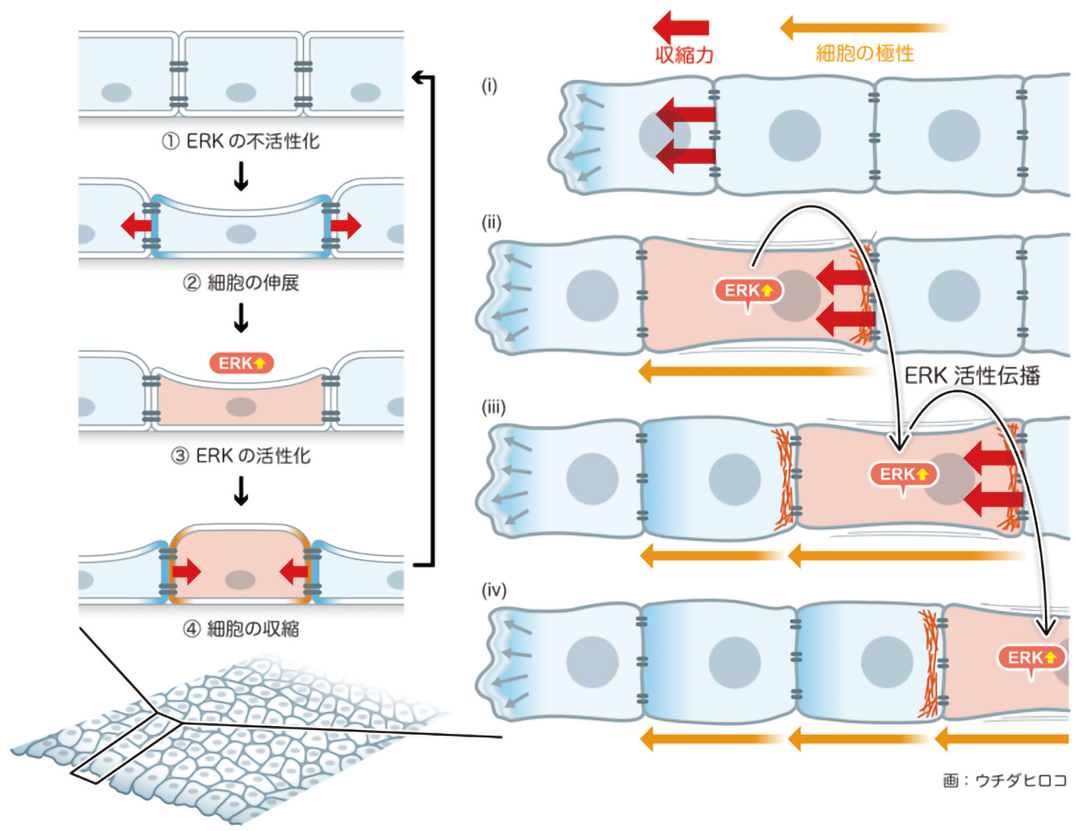 以前本研究グループは、細胞増殖を促進する「分裂促進因子活性化タンパク質キナーゼ(Extracellular Signal-regulated Kinase、以下ERK)」の活性が、創傷治癒過程において波として伝播することを報告しましたが、その制御機構については多くの謎が残されていました。