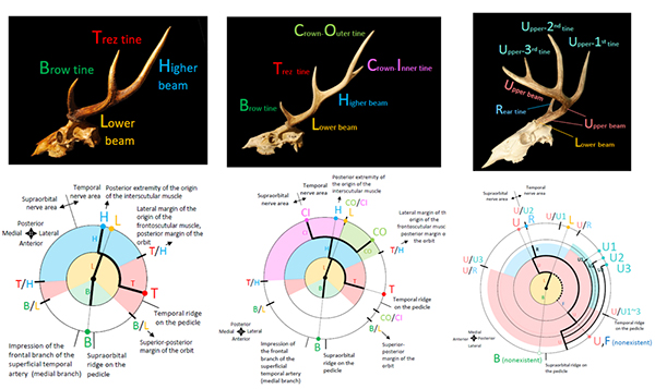 鮫島悠甫 理学研究科修士課程学生 (研究当時)、松岡廣繁 同助教は、「角溝」と呼ばれるシカの角表面に並行的に走る多数のスジに着目し、角の諸構造と頭蓋骨との相対的な位置関係を示す同心円状の「ダイヤグラム」を開発しました。そして、このダイヤグラム上において、複数種間で位置関係が等しいものを相同な構造と認定し、相同な枝には名称を与えた上で、分子系統樹上において、枝の進化の歴史を復元しました。