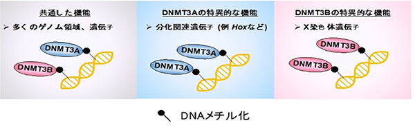 また個体発生過程において、DNMT3Aは分化関連遺伝子を、DNMT3BはX染色体遺伝子を特異的に制御していることがわかりました。