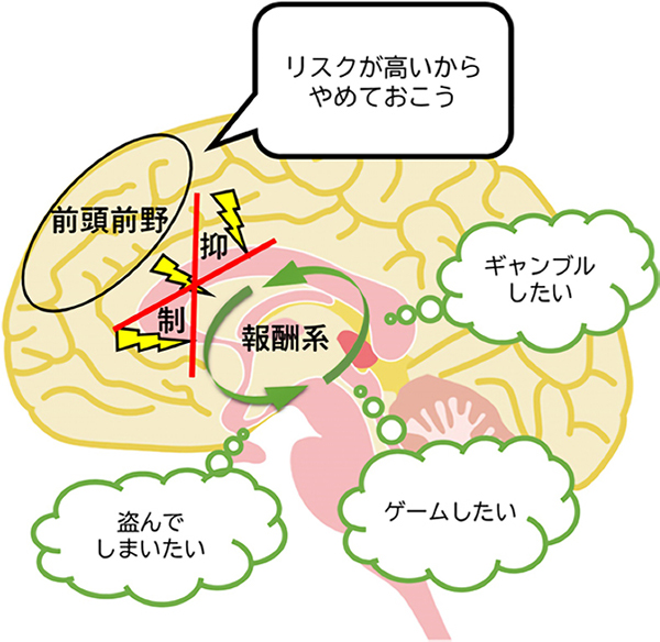 本研究では、窃盗症と性嗜好障害の入院患者と健康な成人男女を対象に、確率計算を伴う心理課題を行い、光トポグラフィーという手法によって課題実行中の脳活動を計測しました。その結果、行動依存症の患者は確率から物事を推測することに困難を示し、その原因として、前頭前皮質の脳活動減弱が関わっていることがわかりました。これらの結果から、行動依存症では、前頭前皮質が正常に活動しない結果、依存行動時の社会的リスクを認識できていないことが一因であることが考えられます。