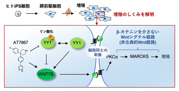 さらに、AT7867がYY1という転写因子のリン酸化を抑えることによって、WNT7Bの生成を上昇させることと、WNT7Bが膵前駆細胞を増殖させる過程はβ-カテニンを介さない経路であることも突き止めました。