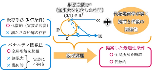 本研究では、制約条件を破ることに対してペナルティを課すという古典的な解法に、多項式を数式のまま計算機で厳密に処理できる数式処理という、比較的新しい技術を組み合わせることで、全ての最適解が満たす条件式を導出しました。明確に方程式として書き表すことのできる最適性必要条件としては、1951年にKKT条件が発表されて以来、およそ70年ぶりの成果と考えられます。この条件式は計算機で具体的な最適解を求めるのに利用できるため、従来のKKT条件では見つけられなかった新しい最適解の発見や、この条件式を基礎とする新たな最適化アルゴリズムの開発に繋がります。