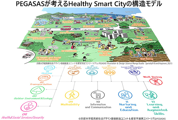 超高齢社会デザイン価値創造ユニットを基盤としたPEGASASでは、あらゆるデータ、科学・技術を活用し、客観的な指標を把握しつつ、新しい産業エコシステムと社会の構築を目指します。議論を重ね、産官学民の技術革新にあふれ、Well-Beingを目的としたまちづくりに必要な領域である住居、交通、食・農業をはじめ、社会的包摂、社会参加・スポーツ・芸術、学習、先進技術の応用など12の領域のあり方の提案を、都会や郊外などを限定せず「Healthy Smart Cityの構造モデル」としてとりまとめました。