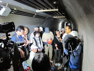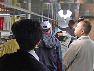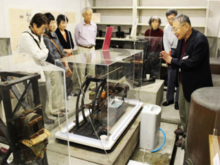 ![]() 「施設探検ツアー」ハルタ山観測坑道内にて計測機器の説明を聞く参加者 | ![]() 「施設公開」煤描き地震記録装置をのぞき込む参加者 |