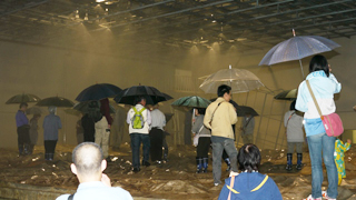 ![]() 人工降雨装置による豪雨体験 | ![]() 浸水ドアの開閉体験 |