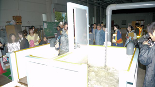 視覚的・感覚的に水の強さや水害の恐ろしさを体験学習していただくことを目的に、「流水階段歩行」、「浸水ドアの開閉」などの体験学習や「土石流再現実験」、「波と津波の変化の実験」などを実施しました。当日は、雨天にもかかわらず過去最高の330名の参加がありました。