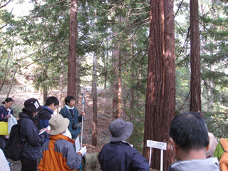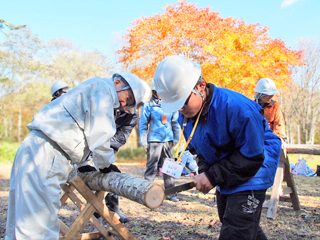 ![]() 丸太を切断しコースターを作成 | ![]() 自然観察での天然林の林相の解説の様子 |