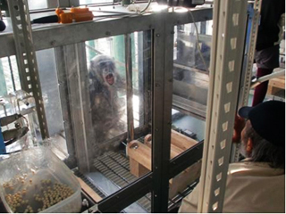![]() 所長挨拶と研究所の紹介 | ![]() 勉強部屋でチンパンジーと触れ合う参加者ら |