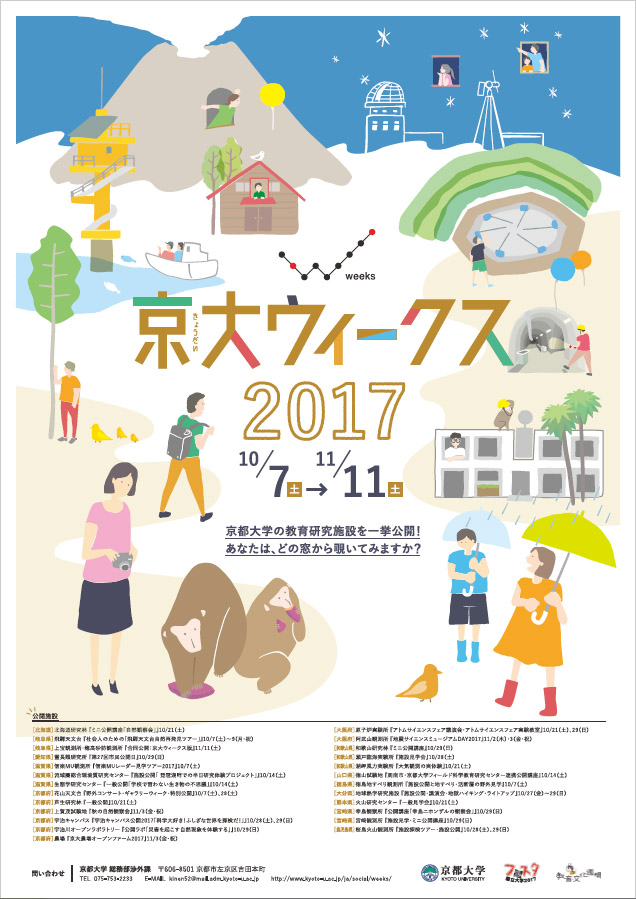 2017年度は、2017年10月7日(土曜日)~11月11日(土曜日)を「京大ウィークス2017」とし、この期間に、北海道の研究林や桜島の火山観測所など計26の施設で、施設見学会や講演会、体験実験、自然観察会など、皆さんの知的好奇心を刺激する魅力いっぱいのイベントを実施します。