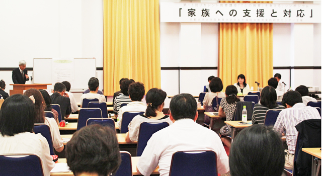 The morning session proceeded in the form of a symposium with three speakers (a psychiatrist, a clinical psychologist and an elementary school teacher) who are facing in different ways the issue of "support and response to families." The afternoon session was devoted to case study workshops.