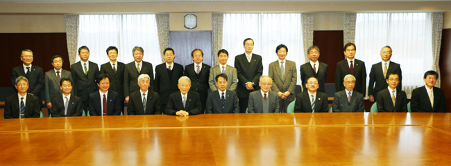 Attending the signing ceremony from Kyoto University were President Hiroshi Matsumoto, Executive Vice-President Toshiyuki Awaji, Professor Yoshimasa Nakamura (assistant to the executive vice-president), Professor Atsushi Moriwaki (assistant to the executive vice-president), and Professor Hiroshi Sowaki (chief advisor to the president for academic affairs); from Kyoto Prefectural Board of Education, Superintendent Tsutomu Odagaki, Director Kazuhiko Saito (High School Education Department), and Principal Takanori Yamaguchi (Sagano High School); and from Kyoto City Board of Education, Superintendent Yoshihisa Ikuta, Director Shinichi Miyake (School Guidance Department), and Principal Hideaki Murakami (Saikyo High School). After signing the agreement and MOU, President Matsumoto, Superintendent Odagaki and Superintendent Ikuta firmly shook hands and confirmed the future trilateral cooperation. Principals of other designated high schools were also present at the ceremony.