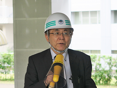 Uji-shi Higashi Fire Station's fire prevention director Kadota commenting on the drill