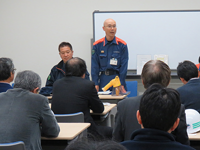 Upon the drill's conclusion, Dr Yasuaki Kishimoto, director of the Institute of Advanced Energy (IAE) and organizer of Uji Campus events, delivered remarks, followed by Tetsuya Kadota, director of the fire prevention division of Uji-shi Higashi Fire Station, commenting on the participants' performance. An exchange session then took place, where representatives of the Fire Station and the Uji Campus in-house fire brigade, as well as other participants, actively discussed disaster responses.