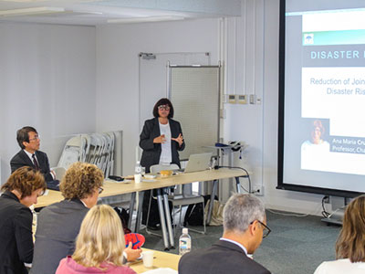 Professor Takashi Watanabe, director of the Research Institute for Sustainable Humanosphere (RISH), greeted the visitors with a welcome address, before two Uji-based faculty presented their research; Professor Hiroyuki Yano of RISH discussed his studies of new, plant-based materials, and Professor Ana Maria Cruz of the Disaster Prevention Research Institute (DPRI) presented on risk management for large-scale coastal disasters in urban areas.
