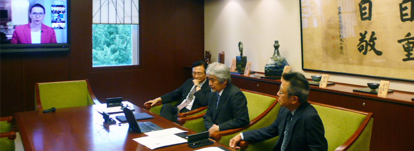 Signing ceremony with the University of Zurich (from left): UZH’s President Siegert (on screen), and KyotoU’s Provost Nagahiro Minato, President Juichi Yamagiwa, and Vice-President Yasuyuki Kono