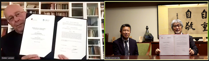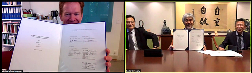 Due to the ongoing novel coronavirus pandemic, the signing ceremonies for the three new partnerships were all held online, with President Juichi Yamagiwa signing the agreements on behalf of Kyoto University. The ceremonies took place on three separate days: 27 July with UZH, represented by President Gabriele Siegert (participating via a video message) and Vice-President Christian Schwarzenegger; 28 July with the University of Hamburg, represented by President Dieter Lenzen; and 5 August with NTU, represented by President Chung-Ming Kuan and Vice-President Hsiao-Wei Yuan (international affairs).