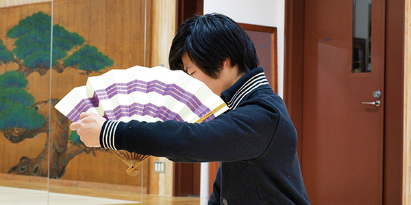 部員の清水桜子さんは、謡本を取り出して、基本となる所作や型をやさしいことばで教えてくれた。能には何百もの演目があるが、立ち方から手足の動かし方まで、型はすべて決まっている。「最小限のシンプルな動きで最大限の演出をする。それが能の奥深さです」。ほかの流派とくらべて、とくに観世流の型はわずかな動きで表現されるという。