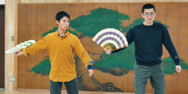 4時間半の稽古で、「謡」と「舞」の型をくり返し練習する。先輩が後輩を1対1で教えるのが基本。「ことばで伝えられることは、限られています。最終的には自分で体得しなければ、身につきません」