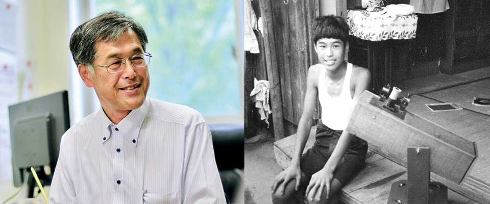 中学一年生のころの家森教授。子ども向けの科学雑誌の「天体望遠鏡のつくりかた」を見ながら作成した望遠鏡との一枚