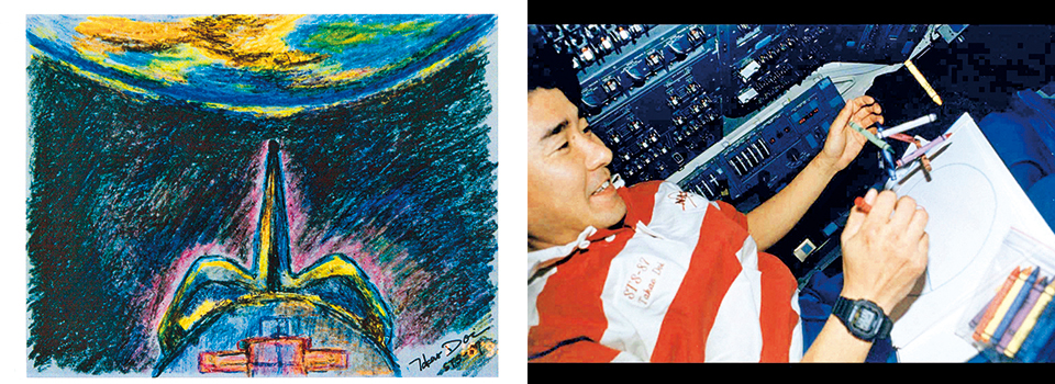 「天上のスケッチ」と、スケッチ中の土井教授。クレヨンの持ちこみがはじめて許可された1997年の宇宙飛行ミッションにて(写真提供:宇宙航空研究開発機構〈JAXA〉)