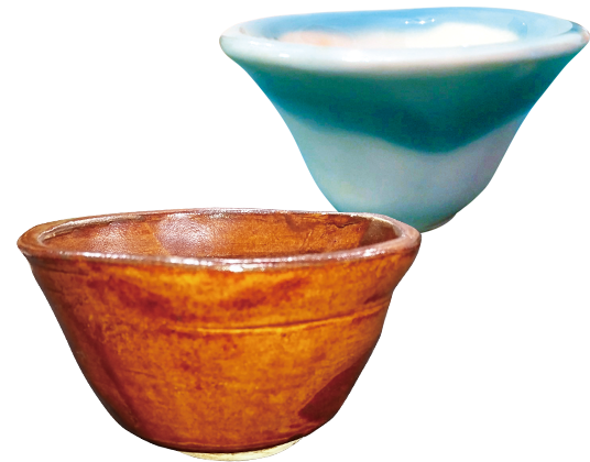 (左)増田さんが入部後にはじめてつくった食器。(上)植村さんお気に入りのおちょこ
