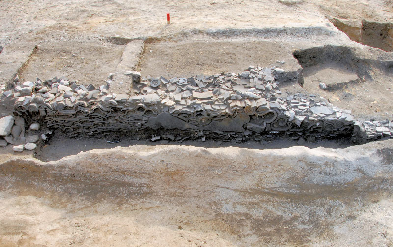 経塚とは、経典を地中に収める施設のこと。なかには青銅製の経筒(きょうづつ)が納められていた。経典は朽ちて残っていないが、経筒の台座からはきらびやかなガラス玉が出土した。 経塚が流行したのは平安時代後期。末法思想がひろまるなか、たいせつな経典を子孫に伝えようと願う貴族たちの思いが伝わってくる。