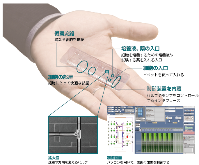 小さな黒い箱に厳重に保管されていたのは、さらに小さなマイクロチップ。縦75ミリ、横25ミリ、高さ5ミリ。手のひらにのせても十二分におさまるサイズだ。「ここに穴があるでしょう。ピペットでこの穴から心臓や肝臓の細胞を個別に入れて、ヒトの体内を模倣した小さな組織をチップの中でつくりあげるのです。生理学的な状況をマイクロチップ上で再現することで、これまでわからなかった人体のしくみの解明にチャレンジしています」。名づけて「ボディ・オン・チップ」。