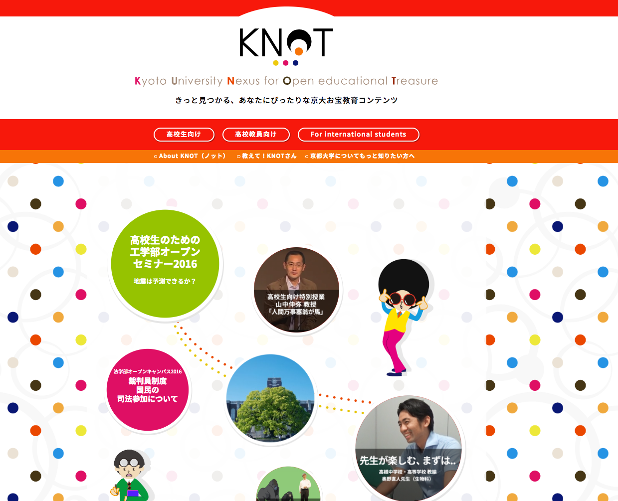 京都大学のオープンコンテンツ(MOOC、OCWなど)のうち、高校生に適していると思われるものを抽出し、紹介するポータルサイト。オープンコンテンツの使用方法や高校生、高校教員へのインタビューも掲載。