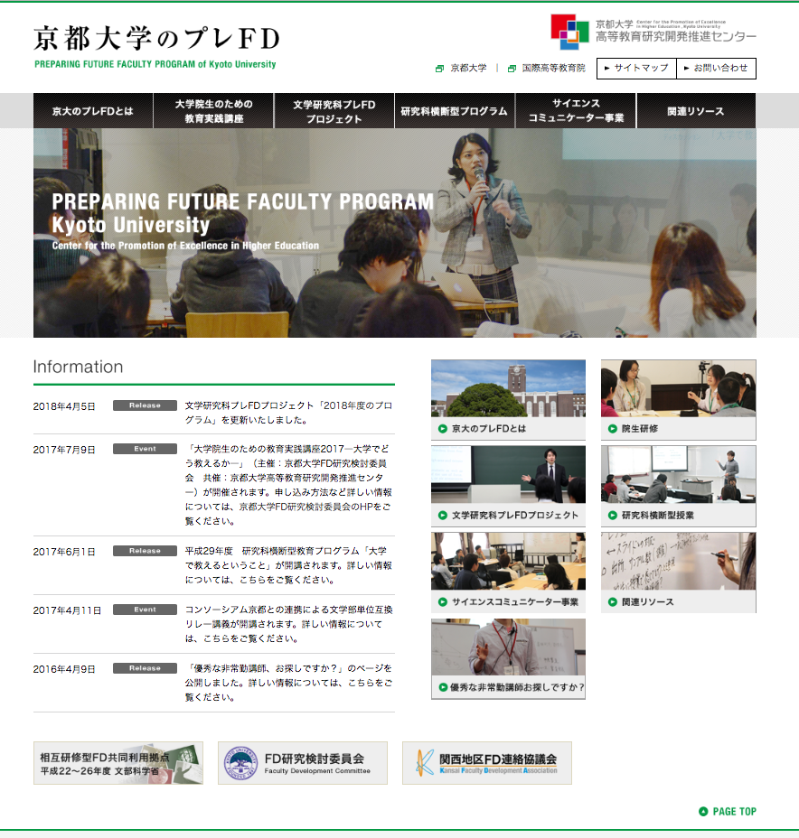 これを解消しようと、2005年に京都大学ではじまったのが、大学教員をめざす大学院生やオーバードクター、ポスドクといった就職前の若手を支援する「プレFD(Faculty Development)」と呼ばれるプログラムだ。