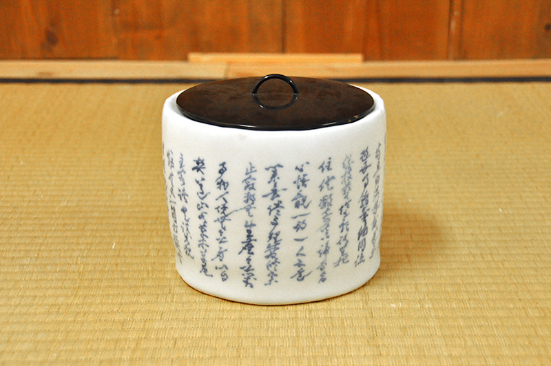 久松先生が製作した水指(みずさし)。側面に書かれているのは、創立時に久松先生が茶道を学ぶ者の心構を説いた「茶道箴(さどうしん)」