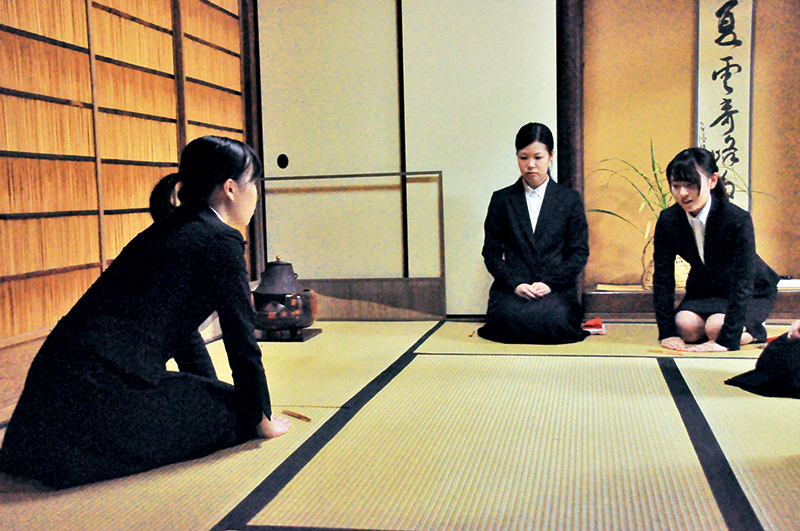 稽古では、指先の美しさからお点前を進める速度まで、気づいたことを互いに指導しあう。部員どうしとはいえ、空気が張りつめる