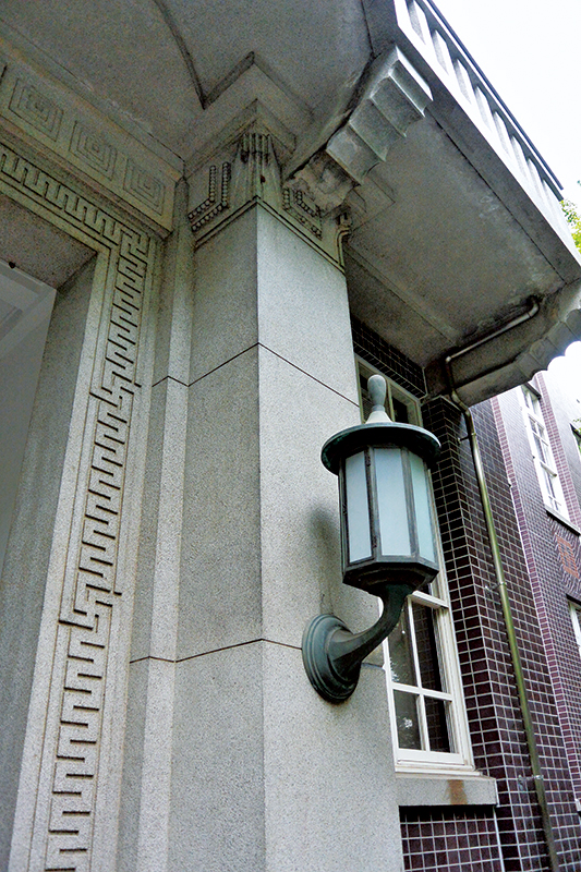 小豆色の外装タイルと、2階上部にまわされた白い帯が引き締まった印象を与える。入口上部の湾曲した壁面とバルコニーなど、正面中央部分には様式の枠から抜けだした斬新な意匠が凝縮されている