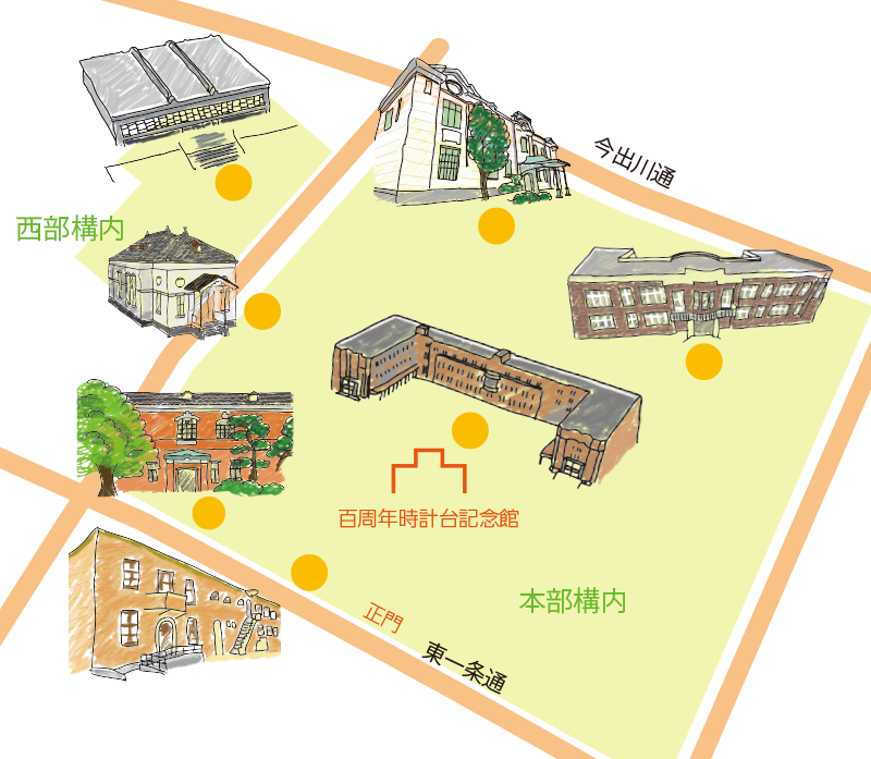 京都大学には、300を超える建物がある。明治の京都帝国大学の時代から、何期もの施設整備が積み重ねられ、現在の京都大学キャンパスが形づくられている。それぞれの時代の材料や技術、デザイン、設計者の思想が反映された建物たち。いつもなら目にもとめないような壁面や窓、造形にこそ、歴史や思想を読み解くヒントが隠されている