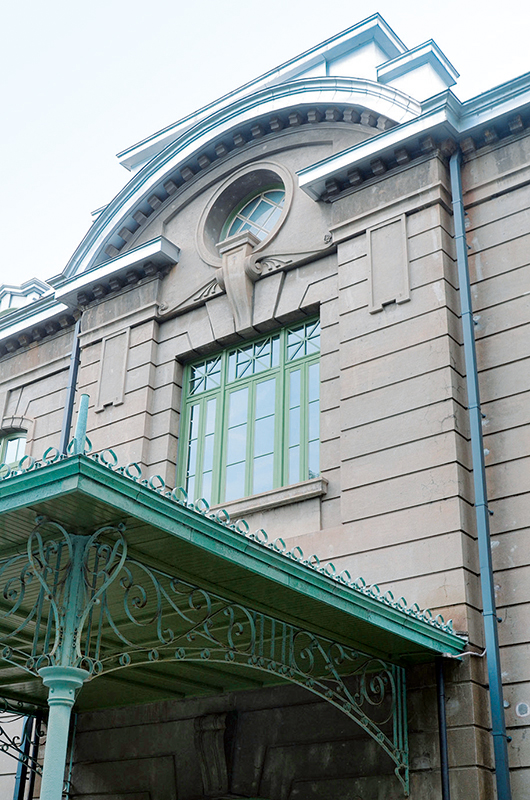 ポーチ●曲線や唐草模様を組み合わせた意匠は、19世紀末にヨーロッパで流行したアール・ヌーヴォーを思わせる。材料はスチール。重厚な建物に比べて、軽くつくることで、優雅で華やかな印象を与える
