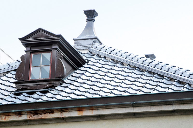 装飾の凝らされたドーマーウィンドウ(屋根窓)と屋根の頂点のフィニアル(頂華)