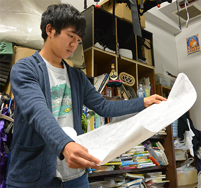 探検道具がひしめく部室。壁に貼られた模造紙には、「パプアニューギニア探検隊」の文字。中土井洋平太さんが挑むのは、憧れの熱帯地域、パプアニューギニア南部の未調査地域への遠征プロジェクトだ。