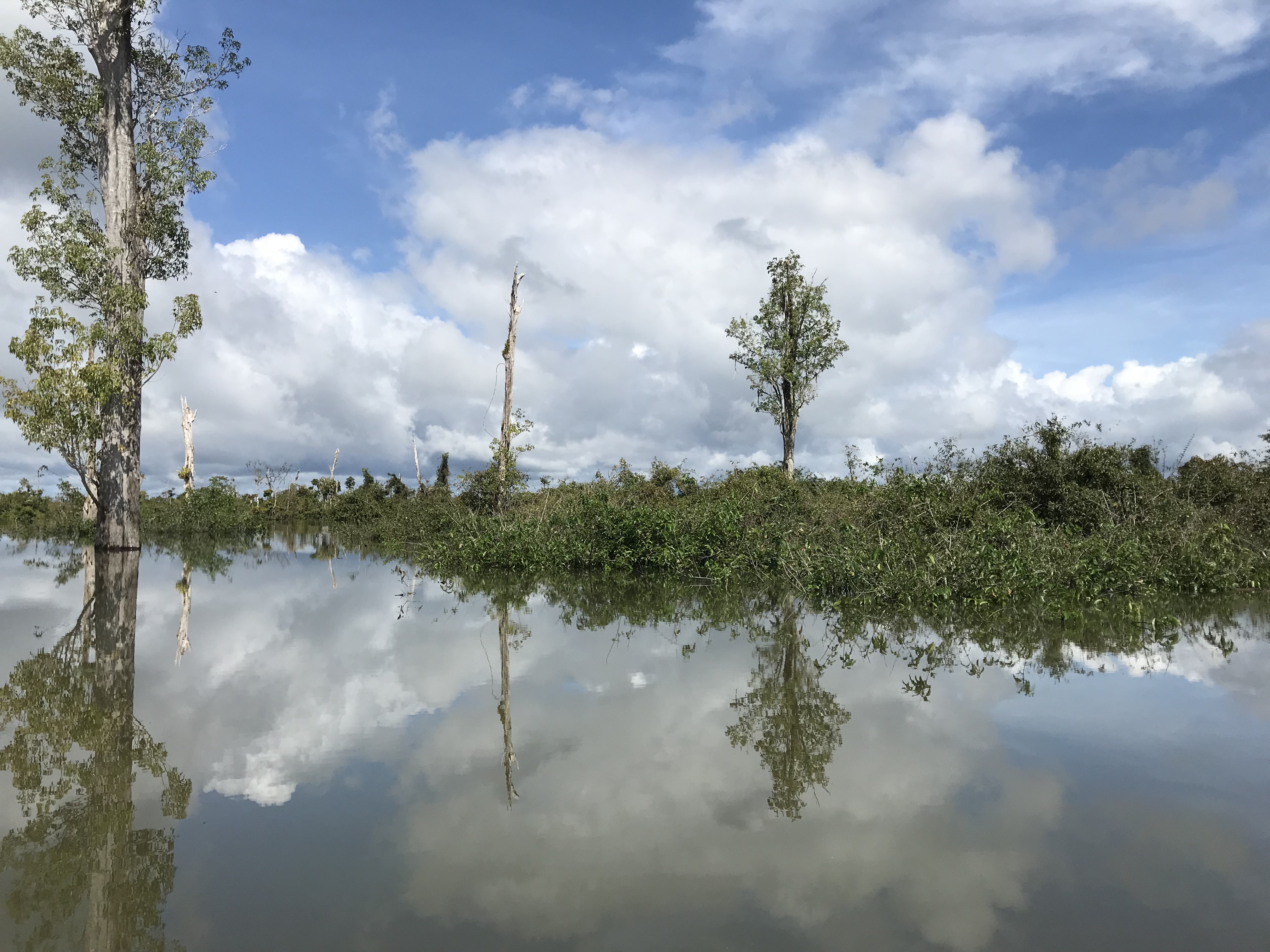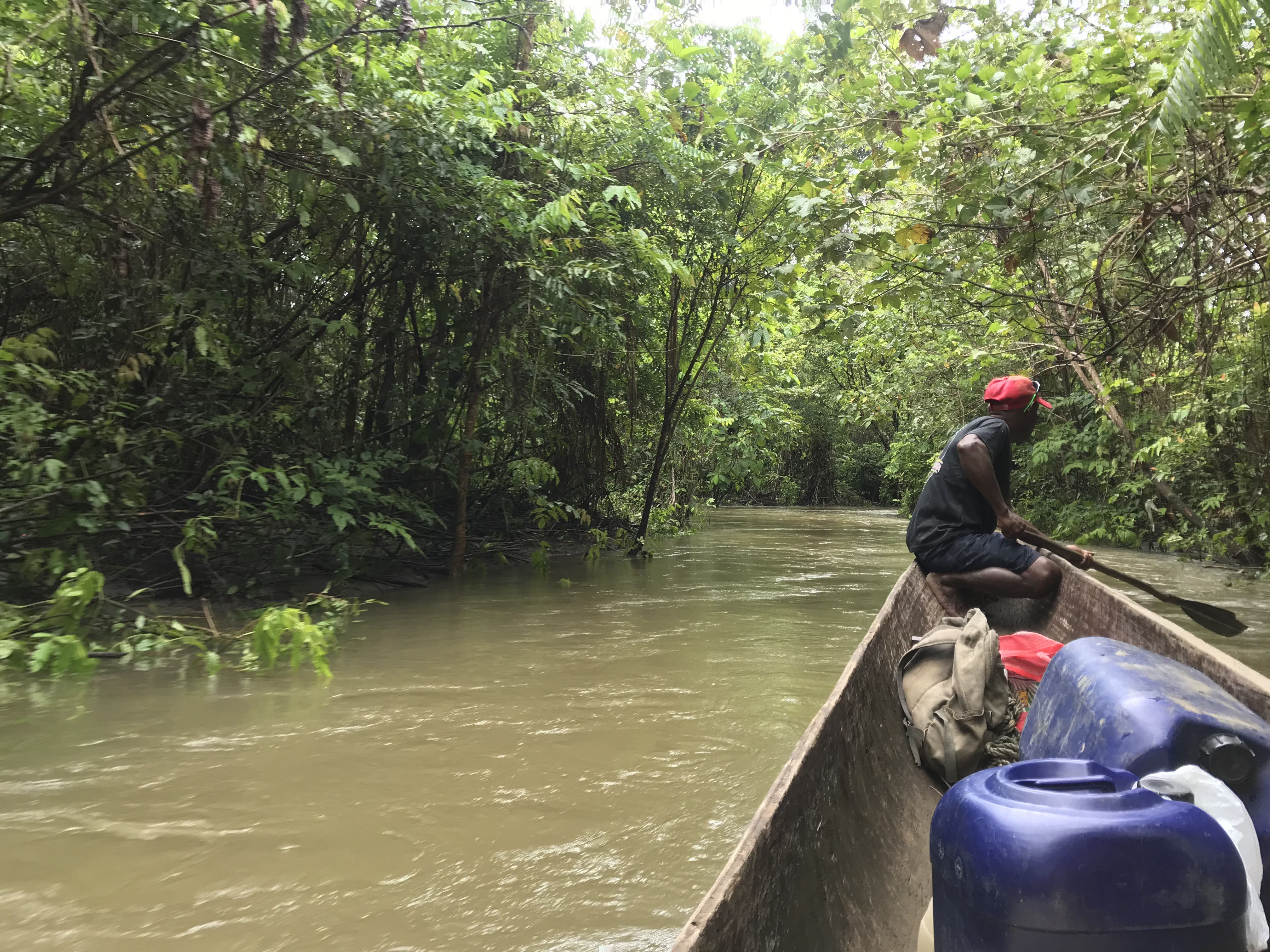 パプアニューギニアでは、カヌーに乗っての移動が基本。銅山の工業排水が原因で木が枯れるなど、熱帯雨林が破壊されているのが問題となっている