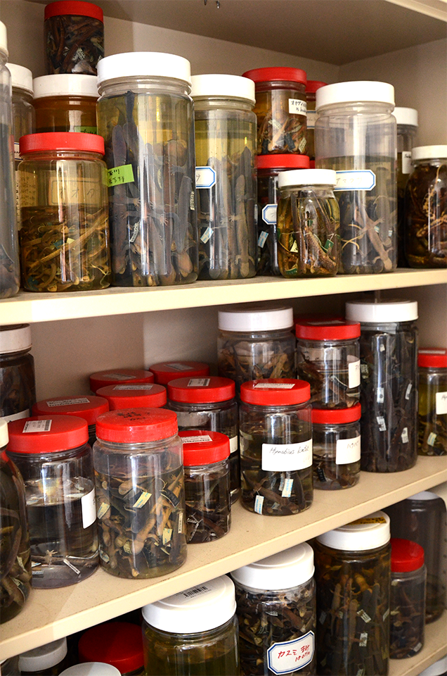 「さあ、どうぞ」。地下標本室の電灯が点いた途端、棚にずらりと並ぶ爬虫両生類の標本にくぎづけに。標本の総数は6万5000点。一見すると雑然と標本瓶が置かれているようだが、一つひとつが〈目・科・属〉、〈採集場所〉、〈採集日〉に分けてラベリングされ、〈あるべき場所〉に整理されている。「あまり知られていませんが、爬虫両生類の系統分類学において、京都大学は日本一の研究実績を誇ります。その裏付けとなるのは先代の松井正文先生から40年以上続く研究室の歴史と、アジアでも有数の標本の数です」。