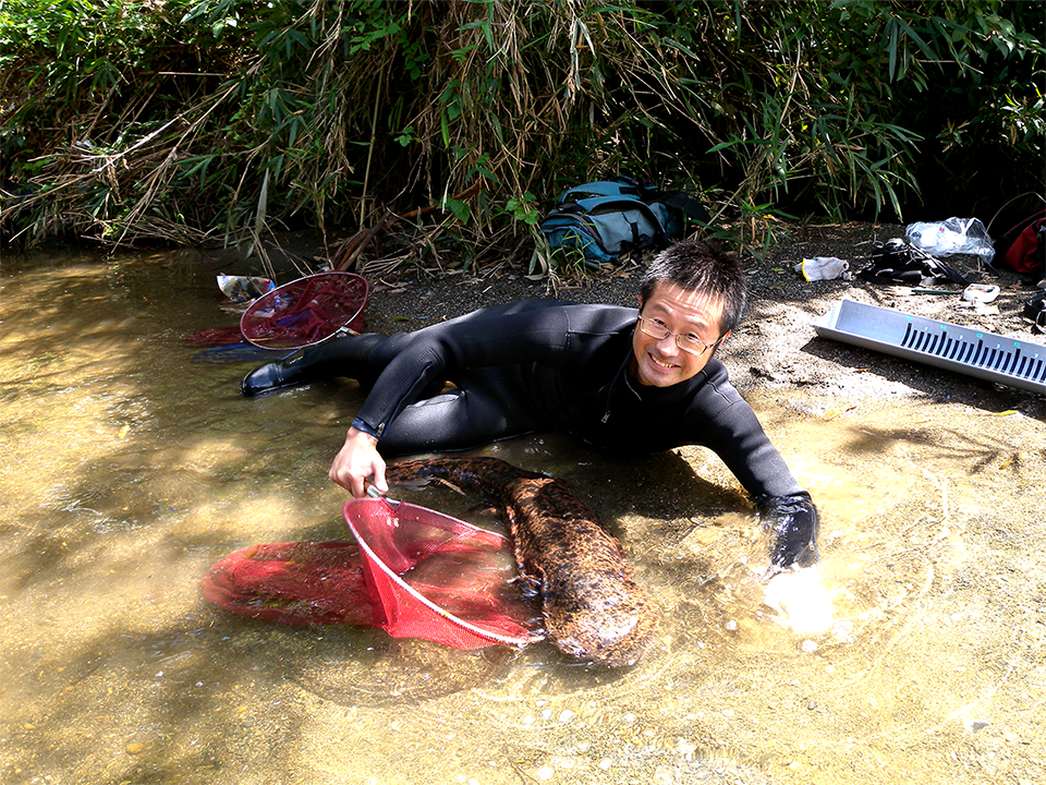 2万種におよぶといわれる爬虫両生類の中で、小型サンショウウオを専門とする西川准教授。研究対象に決めたきっかけは、渓流に入って魚釣りをしたときのこと。「上流から、ヒダサンショウウオの卵が流れてきたのです。光に反射して虹色に輝く、その美しさに感動しました。後でわかったのですが、私のいた渓流は偶然にもサンショウウオの卵を見つけやすい地形だったのです」。