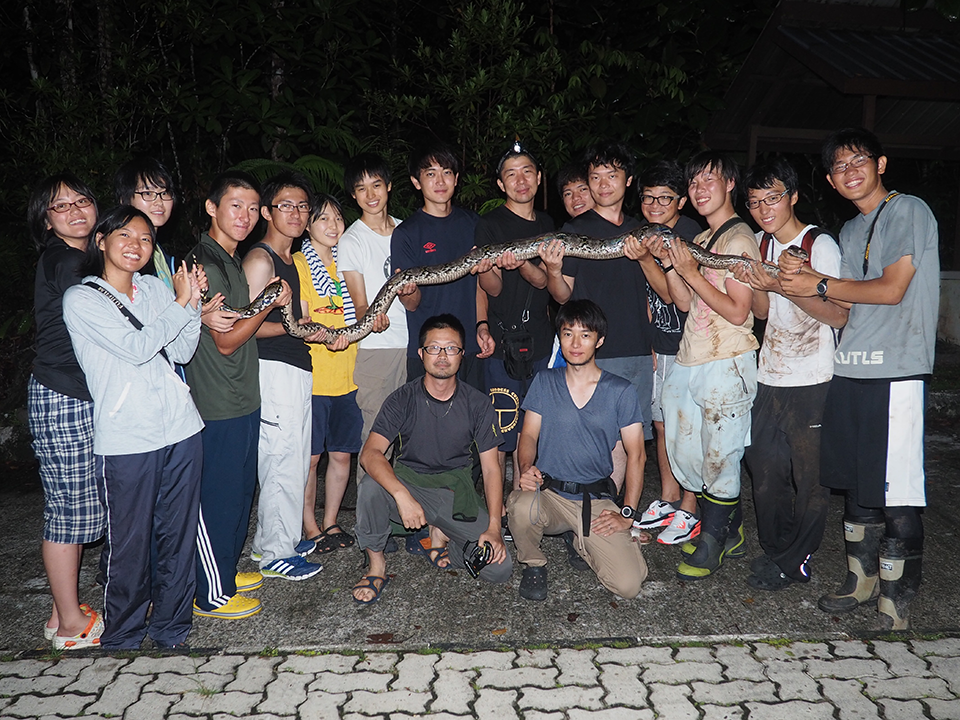 2015年、学生たちにフィールドワークを体験してもらうボルネオスタディーツアーにて。体長3.5mのニシキヘビと記念撮影